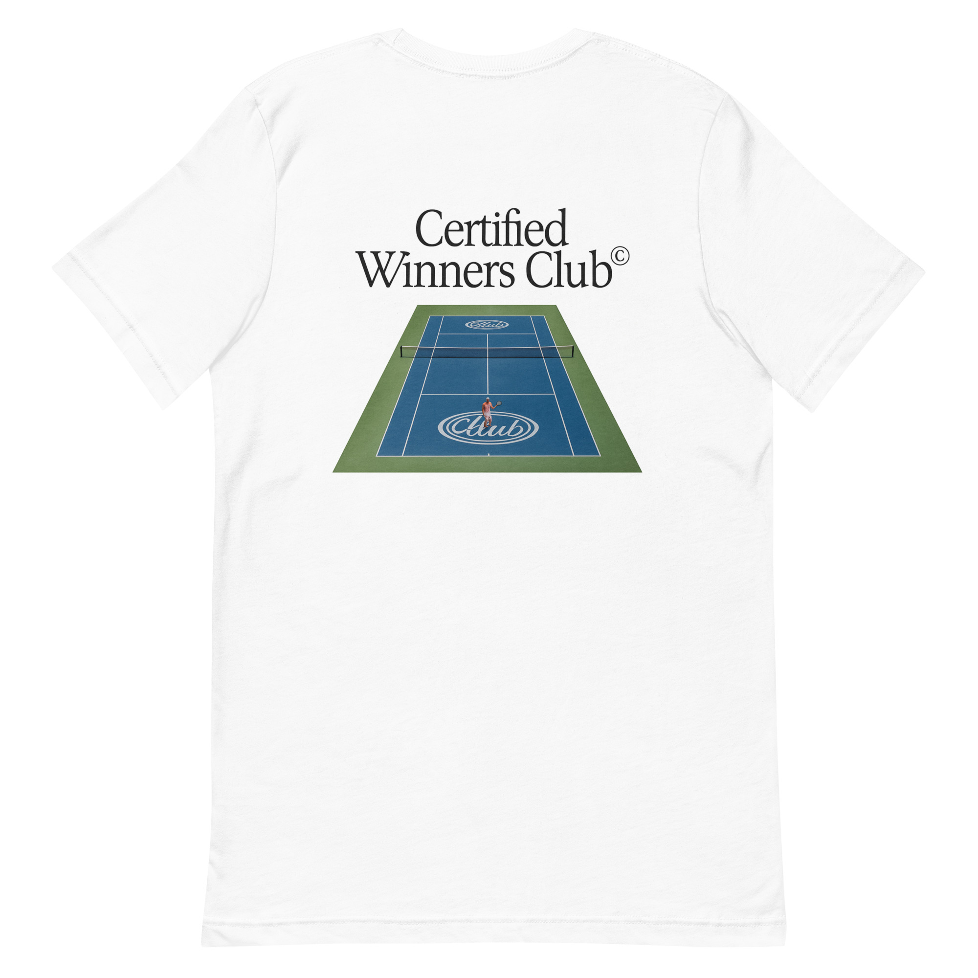 Sätt tonen både på utanför banan vår exklusiva ”Certified Winners Club” t-shirt – en vit t-shirt stilren tennisdesign old money-attityd. Baksidan pryds av en elegant illustration av en tennisplan tillsammans texten Certified Winners Club®, perfekt för dig som älskar sporten vill signalera vinnarkultur.