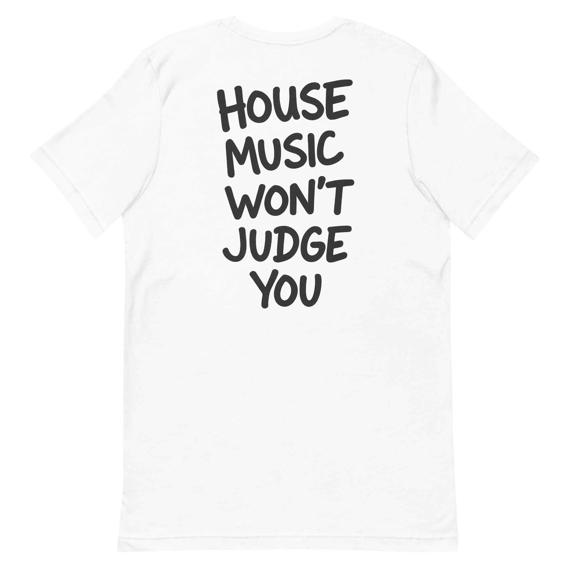 Let the beat set you free. Den här House Music T-shirten hyllar det som verkligen betyder något på dansgolvet – gemenskap, musik frihet från dömande blickar. Med texten ”HOUSE MUSIC WON’T JUDGE YOU” tryckt stort på ryggen, blir den ett statement för både stil värderingar.